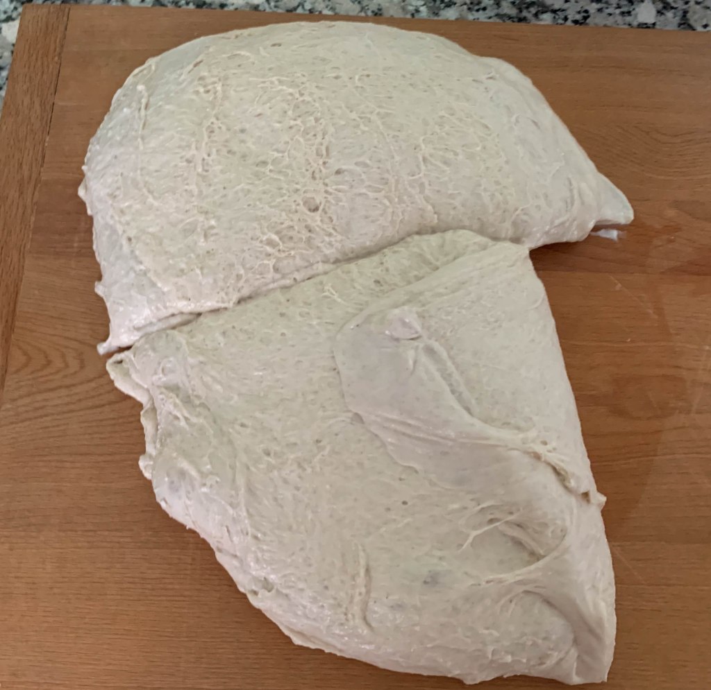 One batch had 100% 00 flour from Italian wheat (took me back to last year’s ride through many miles of Italian wheat in Puglia and Basilicata). The other batch was 100% unbleached bread flour. After 2 hours & 5 stretch and folds both batches went into the refrigerator (in this case for 36 hours)