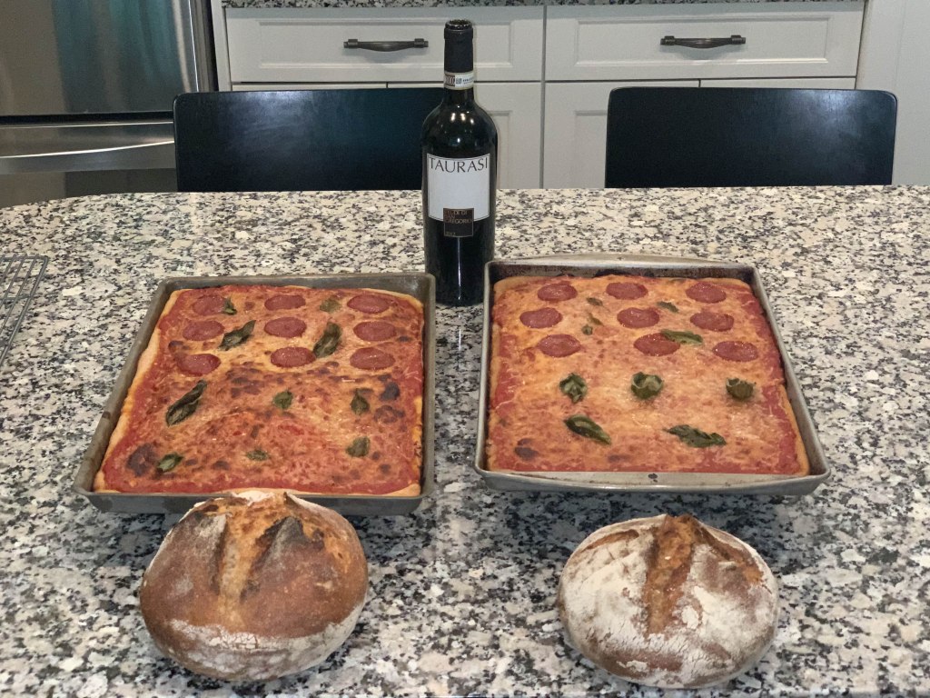 The end result – two pizza and two small loaves of sourdough bread; one each 100% 00 Italian wheat flour, and the other 100% unbleached bread flour.