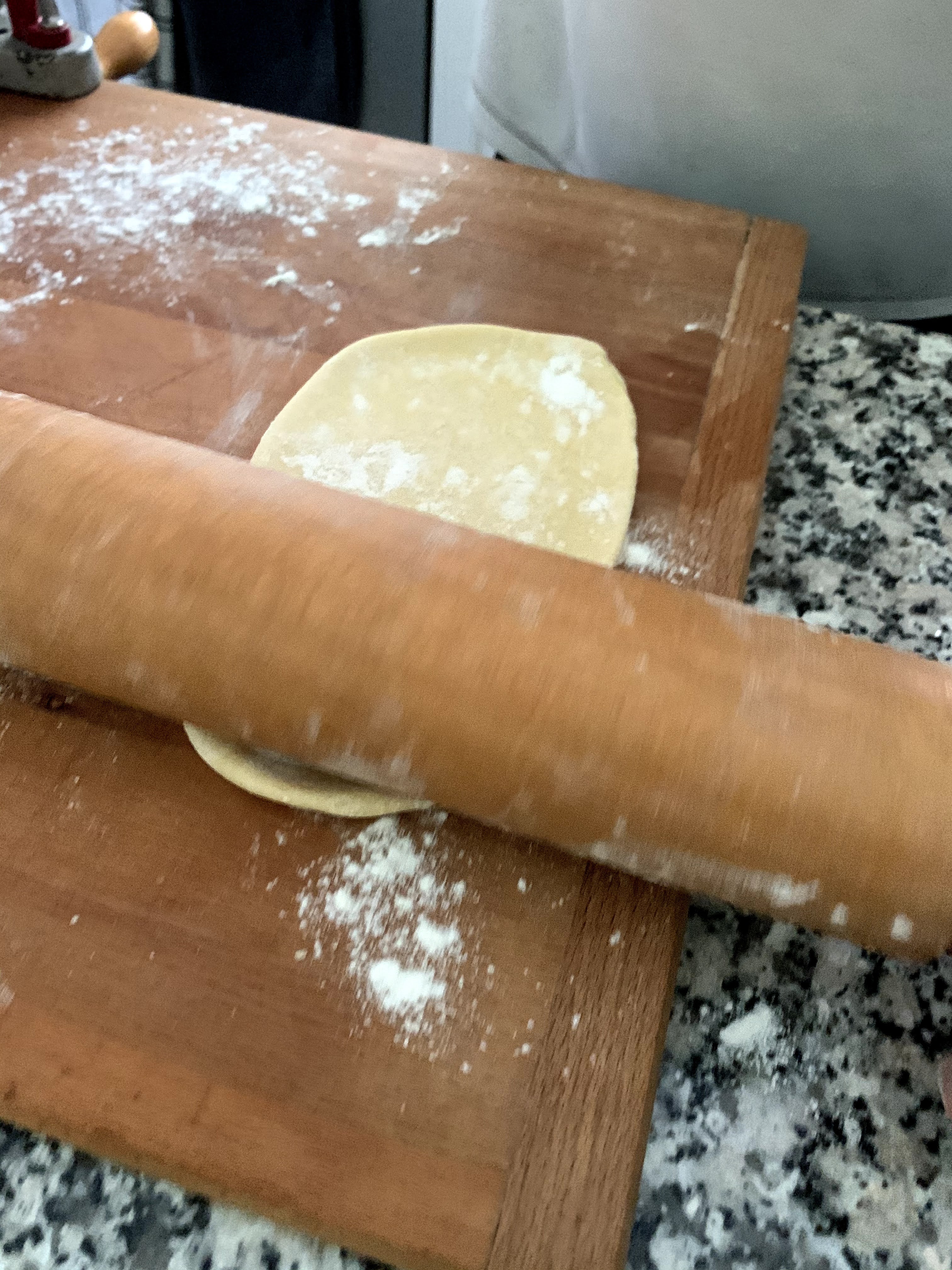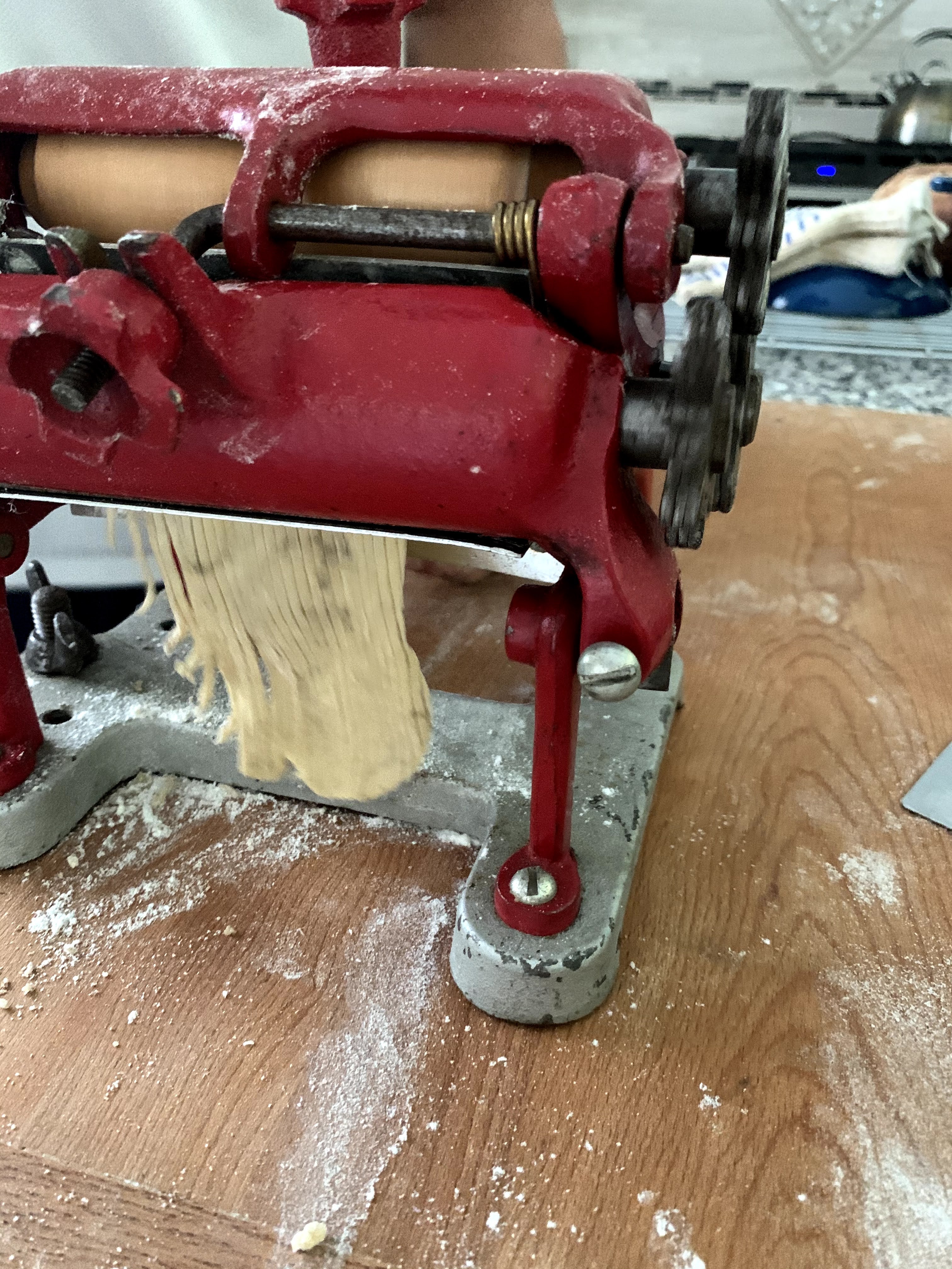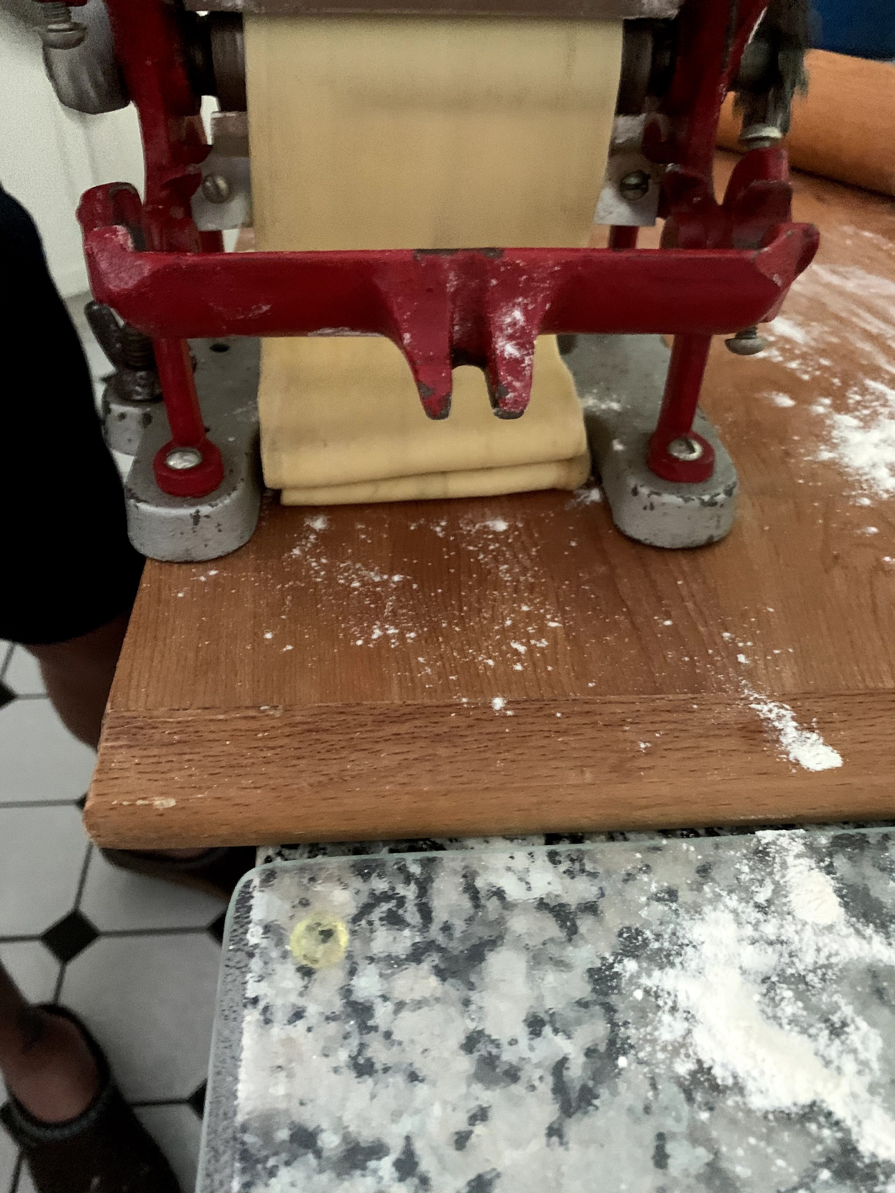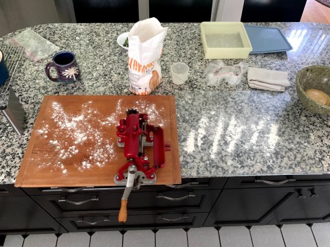 So I ran the dough through it 8 – 10 times while tightening down the “thickness nut” with each success pass. The dough was getting nice, thin, and transparent although a little dirty because it was picking up dirt and the dirty olive oil that I had used to lubricate it.