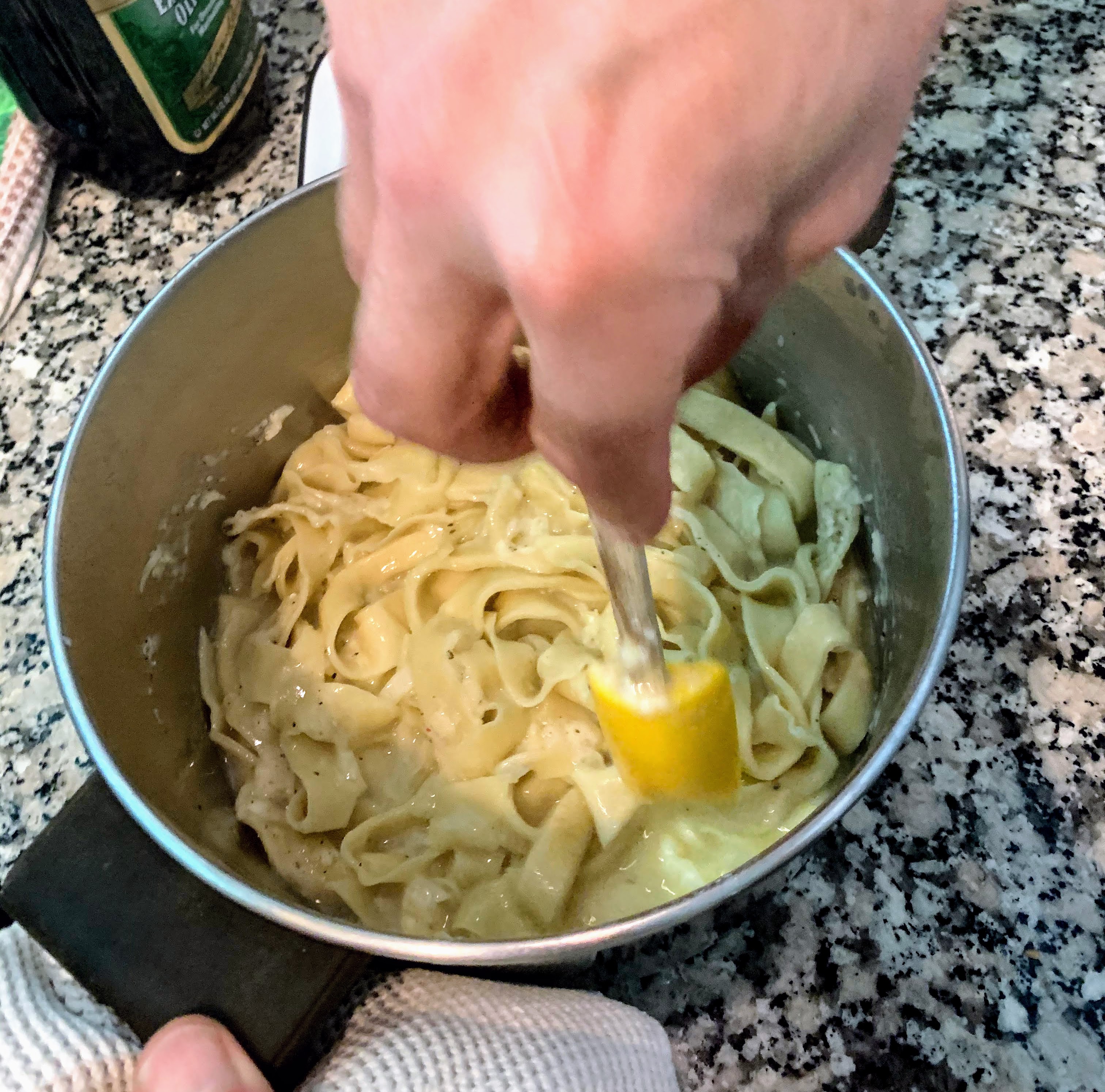 BUT, do you remember me putting the pasta next to the stove top? Well, when I grabbed a “ball” of fettuccine, the individual cut strands had formed into a soft blob of dough with no discernible strands of pasta…YIKES! My guess that it was too hot near the stove between the baking bread and boiling water.