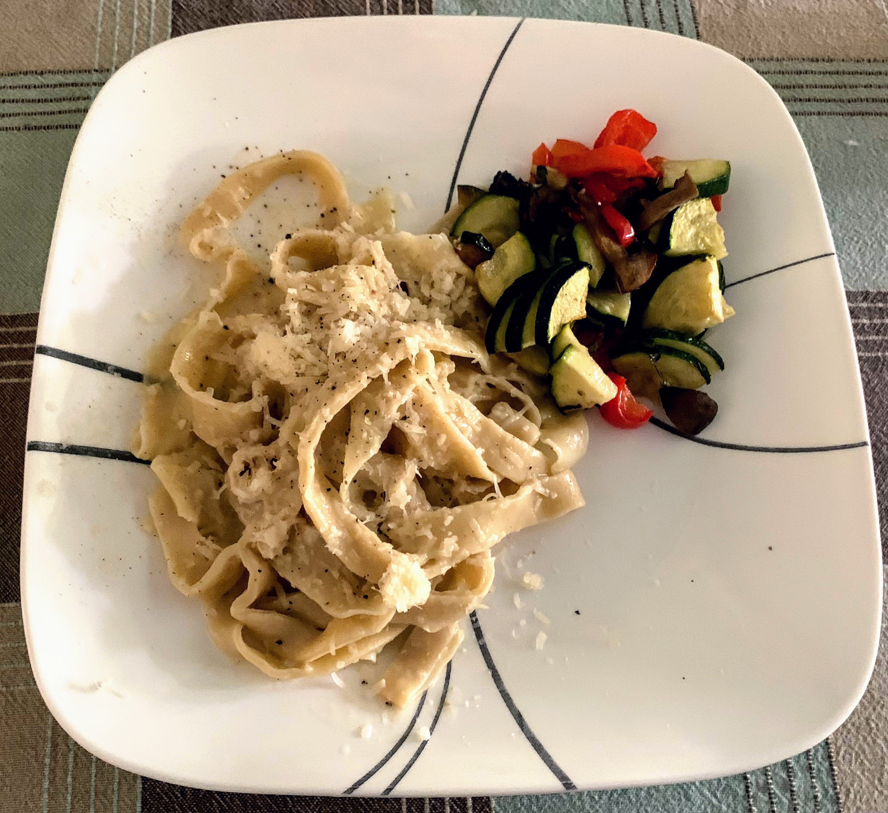 Despite the cluster, the reconstituted fettuccine was Pretty, Pretty Good! Since we were in a rush, the remade pasta was of varying thicknesses. The ticker (as Grandpa Tony would say) ones were a little tough but tasty, while the thin ones were very pleasant!
