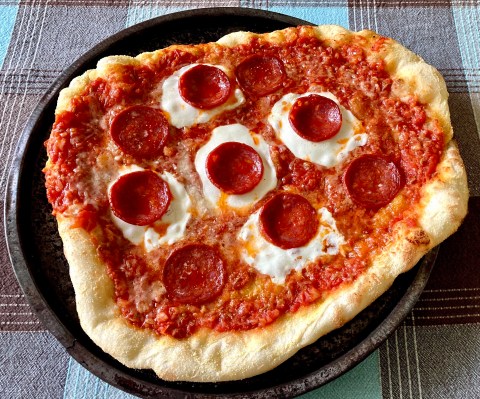 I made my “standard” Aunt Theresa sauce, and used my standard mix of moozedell (not buffalo, but low moisture) and parmagian, and topped with salame on a few and just fresh basil on the other.