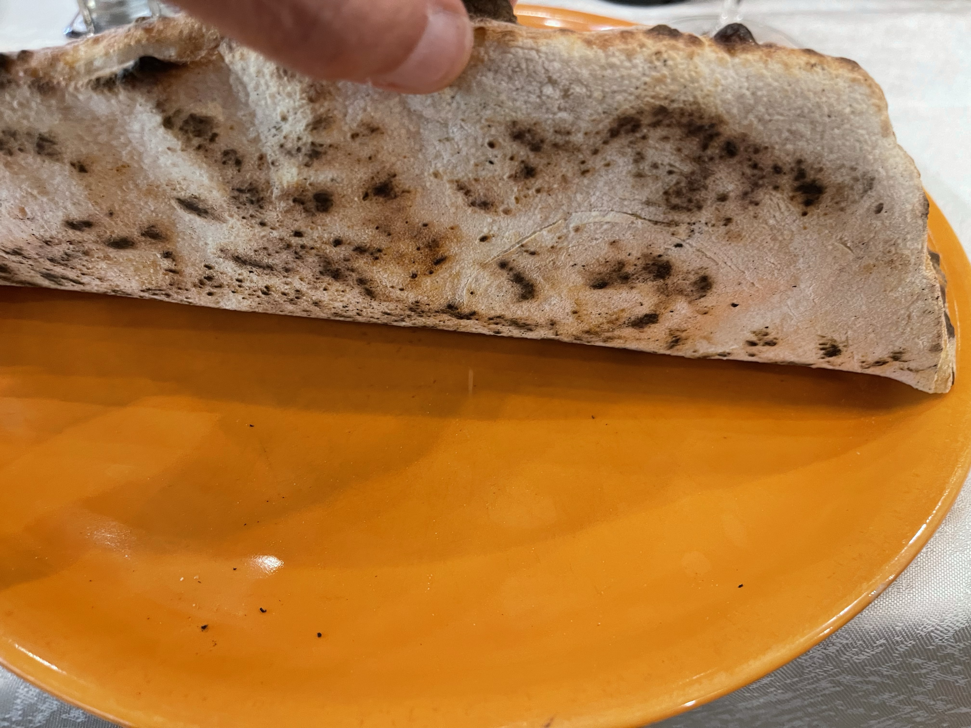 Since it was a genuine wood fired brick oven (unlike Da Alberto from earlier that day), My guess is that the brick was not fully up to temp since we were early customers (for Italy). I’m guessing this because the char, though present, was less pronounced in the flavor than others I’ve had in Napoli. As you can see from the side picture of the slice below, it was very thin but soggy and “wet”.