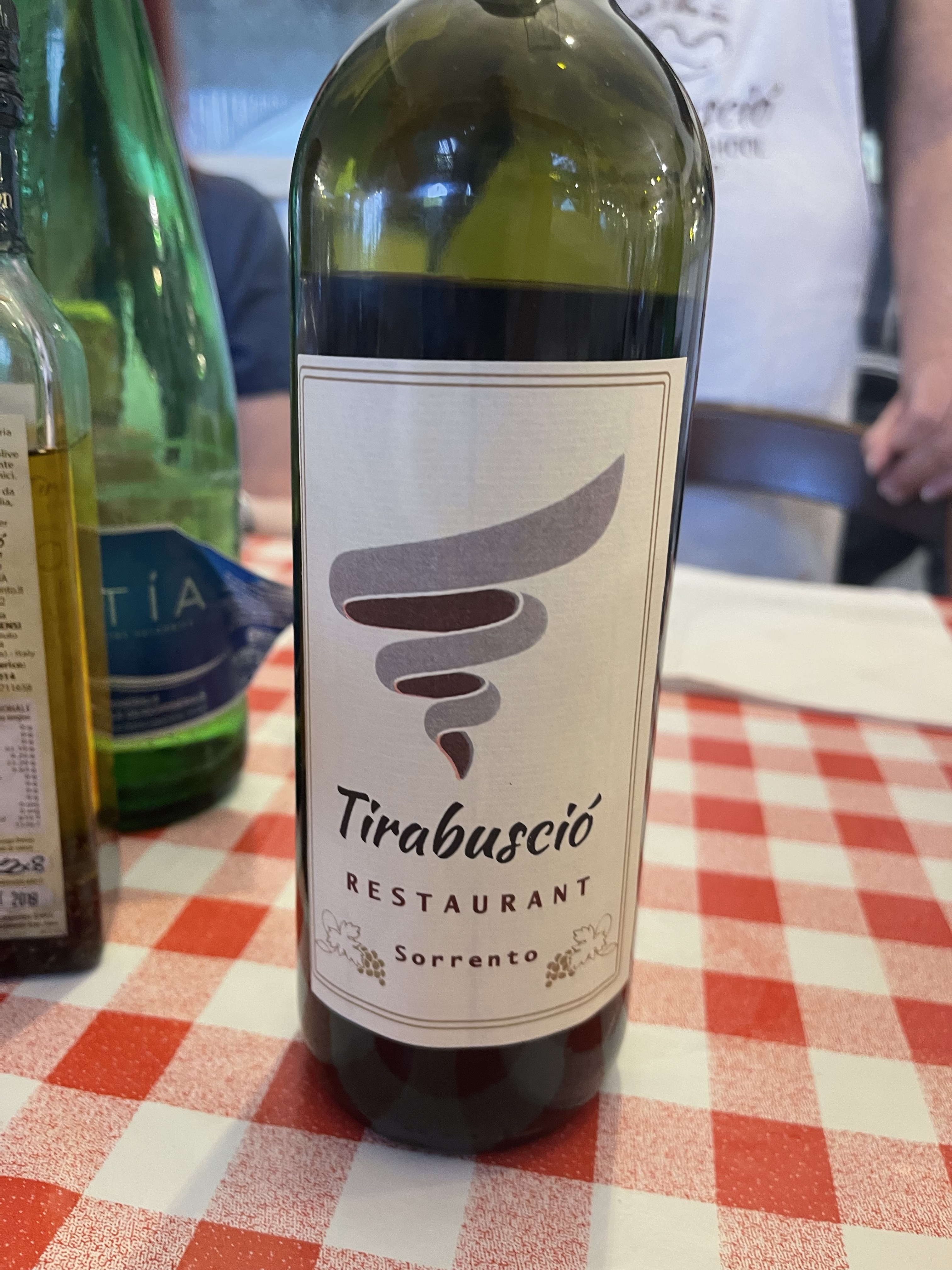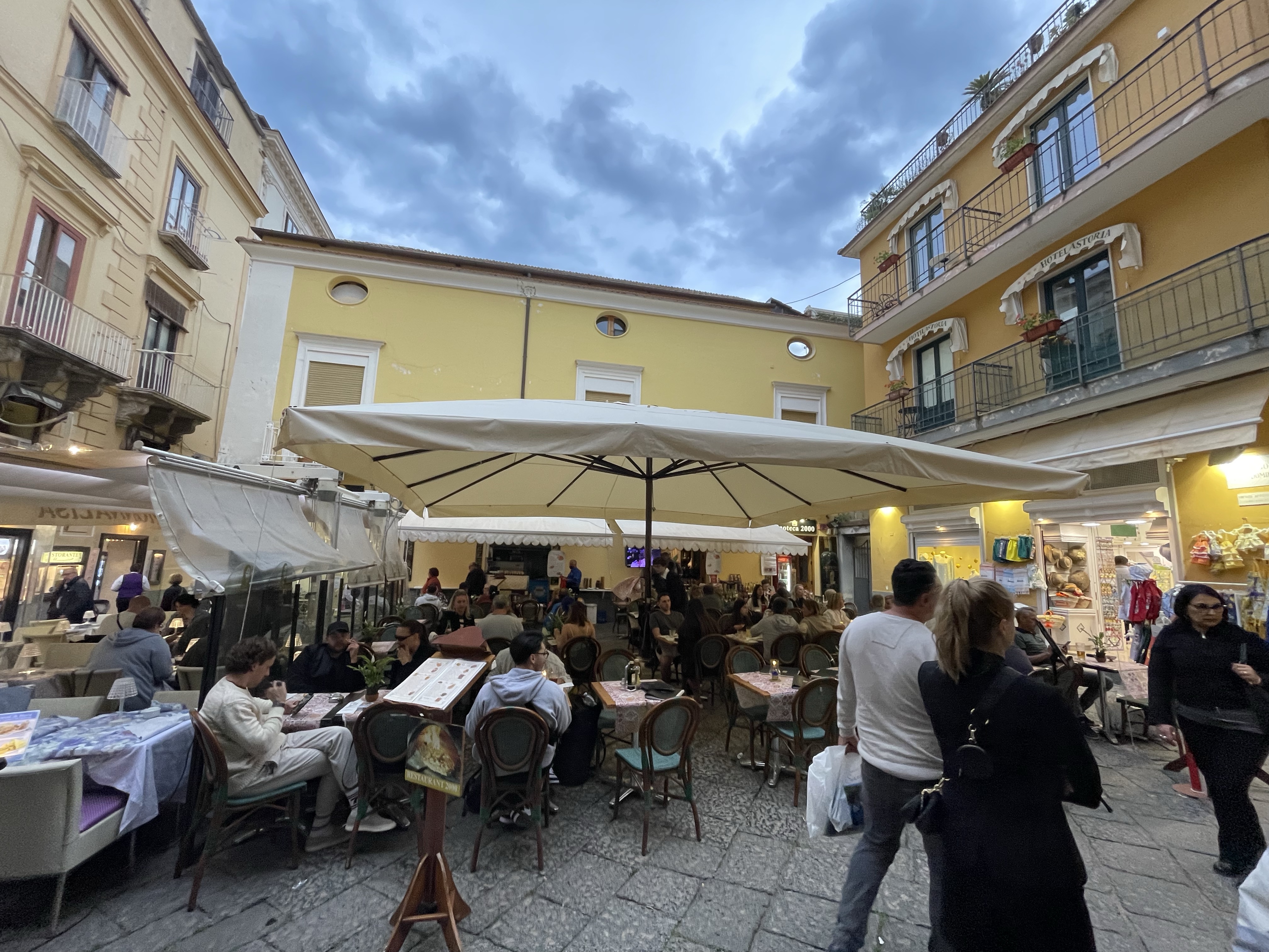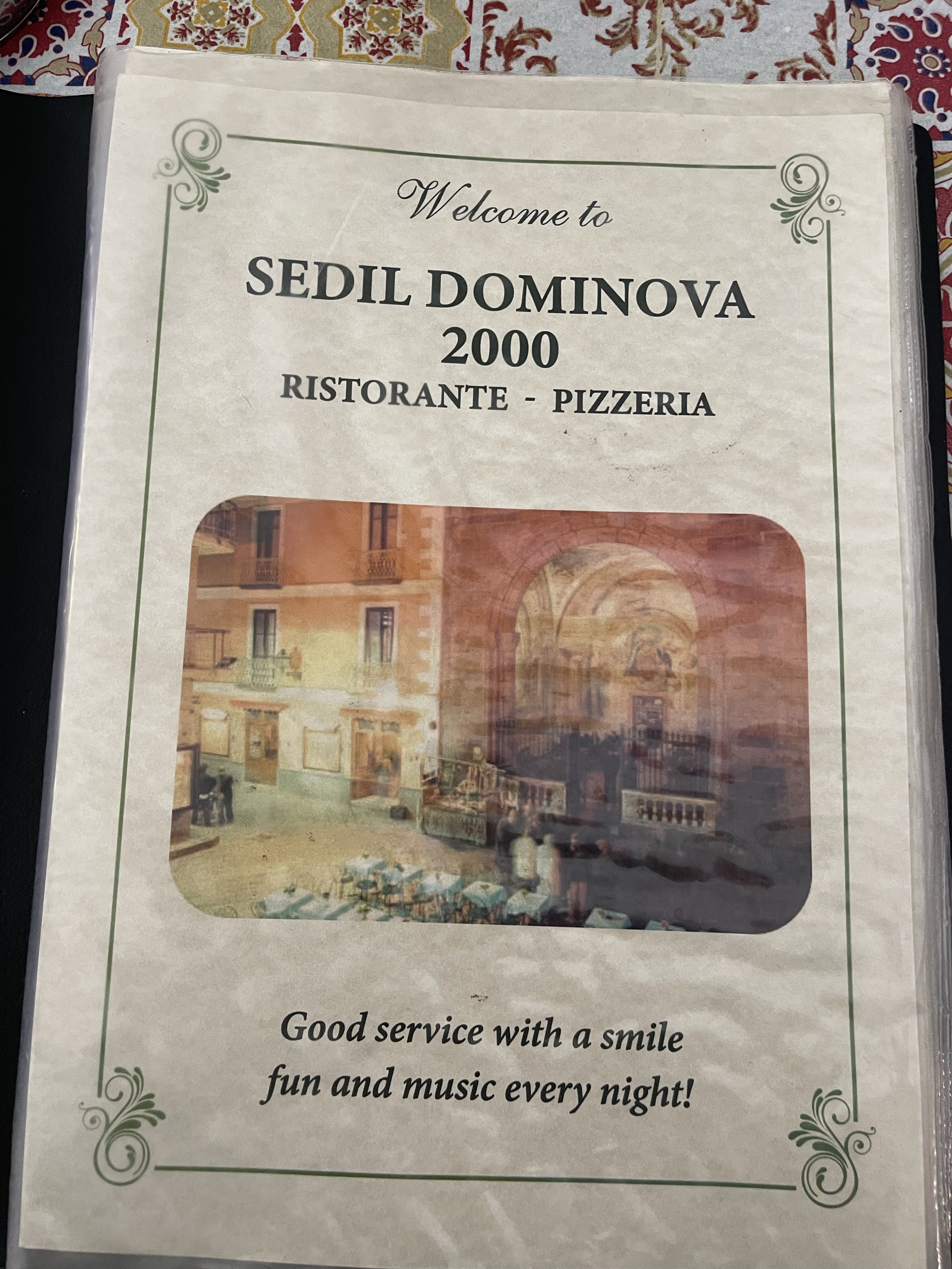 In four trips and about a month’s worth of days in Sorrento, we’ve likely walked passed ristorante Sedil Dominova 2000 a 100 times as it’s in the middle of a busy choochkie shopping area. It’s an open “air” ristorante in Sorrento’s neighborhood that gets its name from the ” 15th-century domed palazzo (mansion)” across the street (see Lonely Planet). Each time we pass, the outdoor seating area of the ristorante is packed. But, as it’s been the theme of this trip, you can’t judge a book by its cover; packed might not mean good!