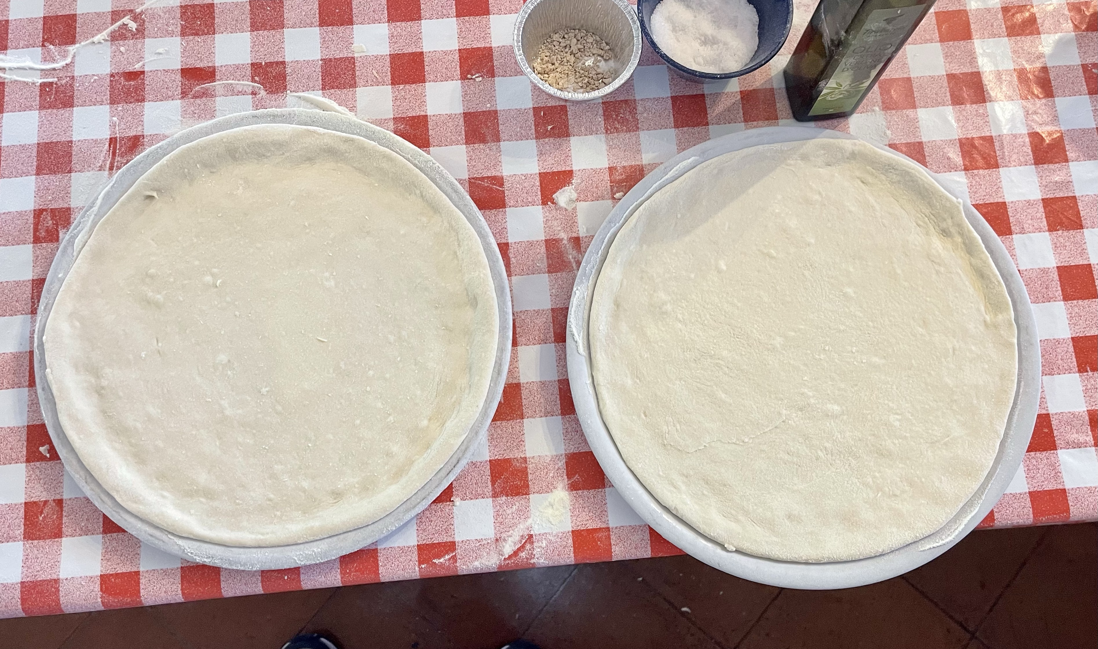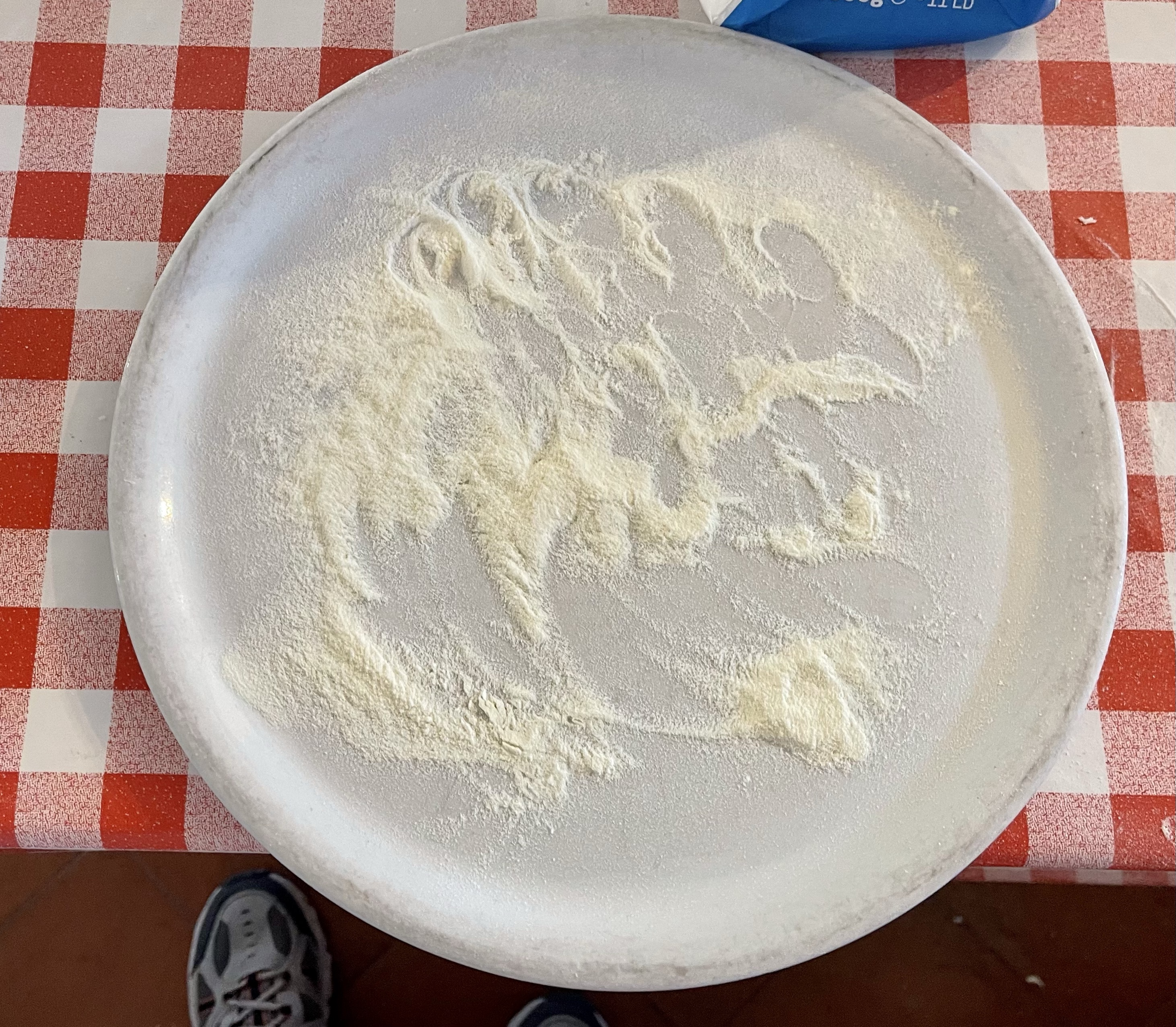 To make the pizzas, our dough was discarded and replaced for dough that Francesco had previously made and refrigerated since we didn’t have 24+ hours for our dough to rise and gain flavor. He also provided a 12” round plate which we dusted with flour to form the dough round. I used my awkward stretching techniques.