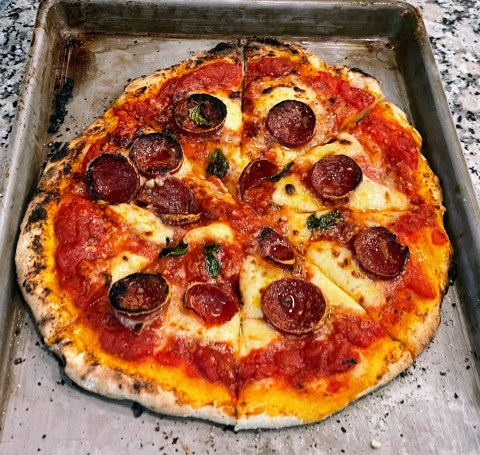 CALL ME IMPRESSED! The last couple were truly great pizzas! The dough/crust was aged nicely for 2 days and had a little sour bite from proper, slow fermentation. As a mentioned, the char and puff were the best that I’ve experienced on pizzas that I made as a result of the oven and my learning curve. The sauce was simple canned, whole San Marzano, oregano, sugar, and Aunt Theresa’s secret ingredient, and was stunningly sweet and tangy. And the cheese, nice dry, full fat moozedell (FROM WALMART!!!!) was perfect for this type of pizza.