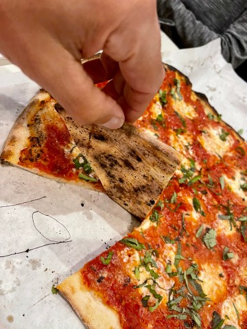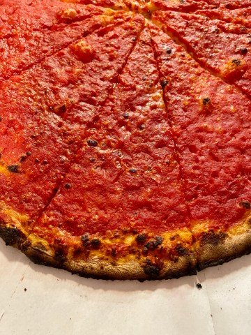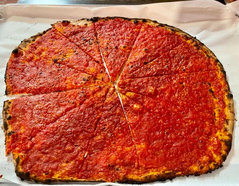 We ordered a plain Tomato Pie (no cheese…likely a mistake). The pizza was delivered on a rectangular baking tray on baking paper. It’s deep red (sauce) and tan and char crust LOOKED INCREDIBLE!