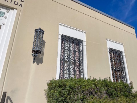 Starting on the exterior, I’m not sure if the facade material is stone, solid concrete, or some concrete skin, but it’s texture and color provide an excellent contrast to the patinaed metalwork and white trimmed wood. The sconces adjacent to the front door and window barring are rare artisan metalwork. And the painted bald eagle above the door is a highlight!