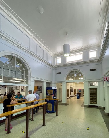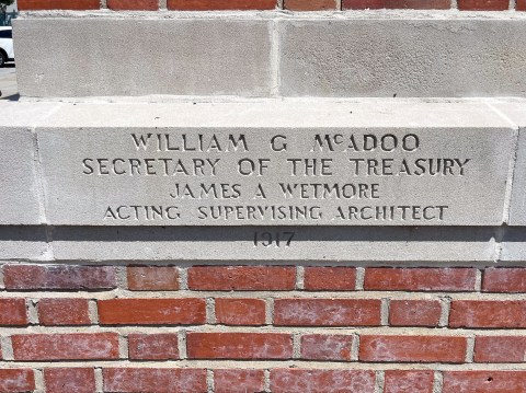 This Post Office also has indications that it has a right-hand addition to the building. As mentioned in the previous post, Wetmore’s designs were symmetric. So, likely the original design are the four windows on the left and the portico. The off-color brick to the right is a telltale sign of an addition.