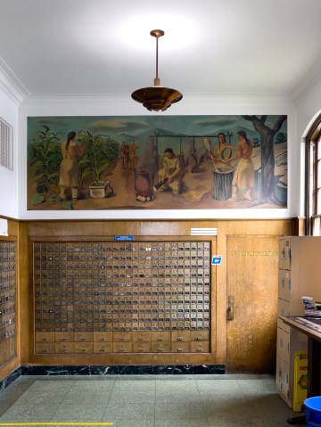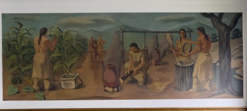 Finally, there is the mural. This is also unusual for most of the country. This mural, “The Life of the Senecas,” is exclusively a Native American scene whereas most others are white families or a combination of whites and Native Americans.