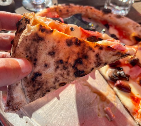 | Good | Maybe | Nice Neapolitan crust with puffy cornicione and wonderful char. Unfortunately, the middle of the crust was under cooked (possibly due to veggies, but no excuses if you want to charge that much). This center mushiness kept this pizza from being great | Good quantity and good taste | Lots of “normal (cow’s milk”) moozedell which lacks the taste of buffalo moozedell – TOO Bad, they’re close | Nice presentation on stainless steel tray at table. Unfortunately, with 4 other pizzas and drinks, the table was much too small, umbrella did little to block blazing sun | At $18, one would expect a true artisan pizza, but they missed on too many factors |
