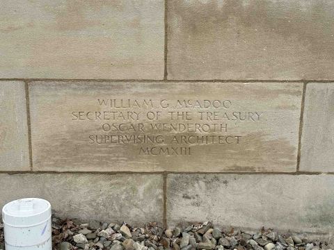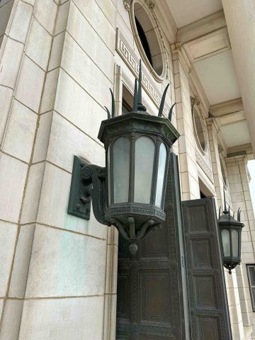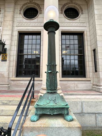 And maybe because it wasn’t a WPA project, it’s much more majestic than many of the WPA Post Offices. The Corry PO is a massive stone (limestone, sandstone?) structure with beautiful buttressed columns, ornate stonework, and several nice touches like the patinaed copper front doors, lamp posts and entrance lights. The crowns on top of the entrance lights are beautiful!