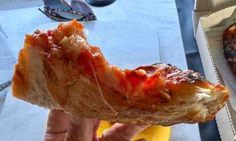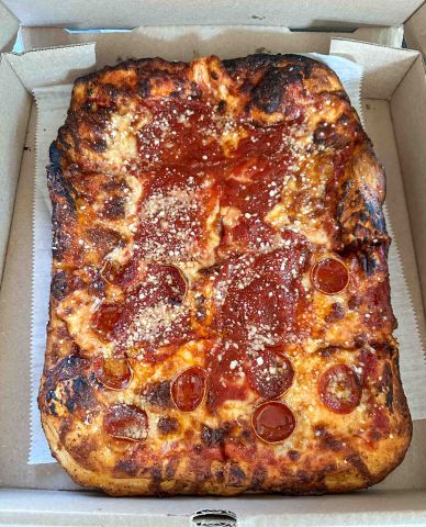The pizza style is a bit of a mashup, like a love child of Detroit and Mahoning Valley. Sounds intriguing, right? In a neat 12″ square shape of full cheese and half pepperoni.