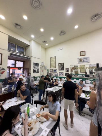 | Ambiance | Mamma Mia! Where do I start? Historical pizzeria in the heart of Napoli. A line for hours. TWO OVENS! Quintessential Napoli pizzeria – the tables, chars, tile, different levels. One hour line when we arrived at 5:30pm, likely about a 2 hour line when we walked by at 8pm! Also, a 30 minute line just for take out! They crank out the pizza! ONLY 4 DIFFERENT OPTIONS FOR PIZZA – DO A FEW AND DO THEM WELL. The interior is littered with celebrity photos and articles. Definitely a tourist joint. Our section of the restaurant had 8 tables of which 6 were tourists, but nice to see that natives will wait in line. |