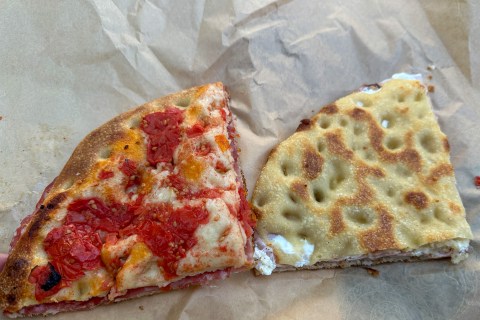 As you can see from the cut above, focaccia is similar to a Tomato Pie in that it is baked in oil to brown and crisp the bottom, but instead of sauce and cheese, it’s cherry tomato cut in 1/2 and pressed into the dough, and then plenty of salt. The Bari style has tasty dough due it’s pan fry and tomato but is a little to salty for my tastes (and heart!).