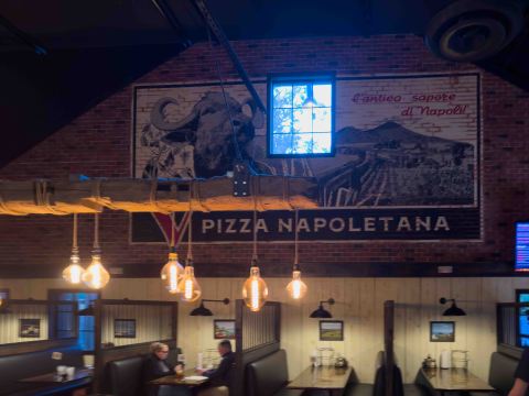 | Ambiance | Two sides, sit down restaurant (which didn’t scream pizzeria) and walk up/sit down area. Not wanting to wait 40 minutes, we chose the walk-up section, but we still had table service, just not as fancy. The walk-up was much more pizzeria-ish The ambiance of the Walk-Up side was a mish-mash motif of a Country Western saloon while country music was playing; cum Coastal Florida vibe; cum Quartieri Spagnoli (Spanish Quarter, see here) in Napoli. It included faux rustic Italian provincial tables but with western style metal chairs and high-back perimeter booths. As you might expect, I chose to believe we were in the Quartieri Spagnoli! Even though my order and organization obsessed mind wished that they’d make up their mind on their preferred motif, it was actually quite cool! Spoke at length with pizzaiolo, says dough is made daily by an old Sicilian guy (I couldn’t tell if he was fibbing, but I’ll go with that too!) |