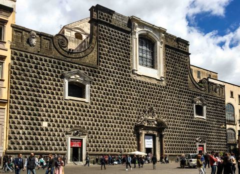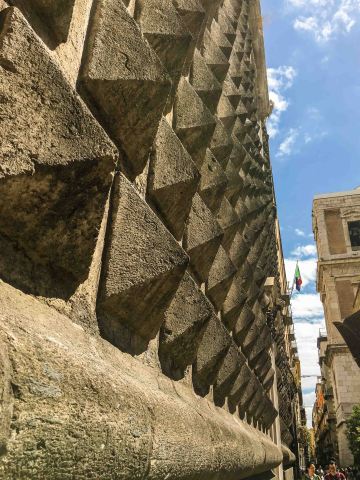 First it’s façade is architecturally wonderful. It has “pyramids with cryptic signs engraved by the Neapolitan stonecutters (from https://it.wikipedia.org/wiki/Chiesa_del_Ges%C3%B9_Nuovo). Given that Great Grandpa Lucio was a stone mason, I feel a connection. Also, these pyramids provide near-mystic, Masonic, quality.
