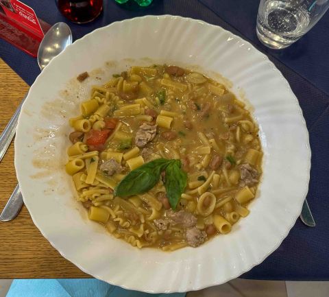 There are chunks of whole tomato, but it’s not a tomato base like I am most familiar. Its brownish base seemed to result from some pork or beef. Also, there are many different types of macaroni.