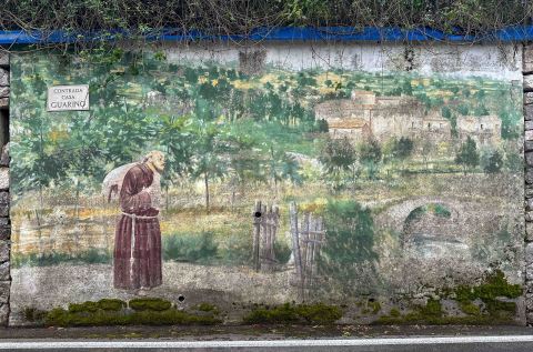 After passing the murals on our hike, a tiny Fiat Punto whizzed past as we descended toward the piazza in Ferrari. A sole occupant was driving, honking her horn, and waving. It was the daughter of Renato and Marissa from Anema e’ Gusto from last evening driving to the ristorante for work from her home in Canale!
