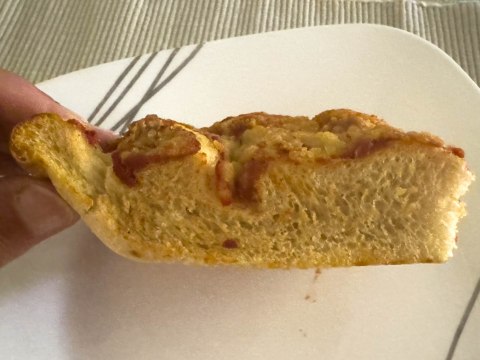 | Sauce | Thin Very little, so little that much of the pizza was orange from sauce rub from the back of a spoon |