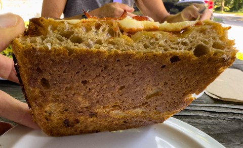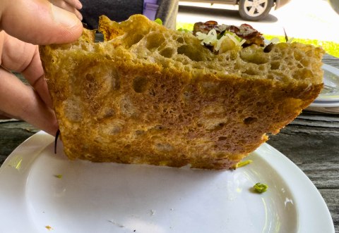 | Dough/Crust | Tickness – Tick Cook – Soft with a crispy crunchy bottom, but still spongy, bubbly, and airy (that’s quite a trick!!!!). This young woman knows her dough! Flavor – LIKE NO OTHER PIZZA THAT I’VE EATEN!!! There’s a delightfully strong tinge of whole grain which I later found out to be locally grown spelt that is specifically ground for Wildflour. The Pizzaiola said that she mixed the spelt with another flour. I thought I heard it to be “burrata”, but I couldn’t find a reference for that on the web. I’ll need to ask when we return. But, given the amount of air in the crust, it’s hard to imagine that that flour was not a higher gluten variety in order to maintain the air in the dough. Also, all recipes that I’ve found that use spelt flour call for an additional carbohydrate (sugar, honey) to be added. This will add energy to the flour mix given that the spelt has a lower carbohydrate content than white flour. The carbohydrate energy is needed in order to feed the yeast and allow rising (and air) to occur. An added carbohydrate would also explain the slight sweetness that’s apparent in the crust. |