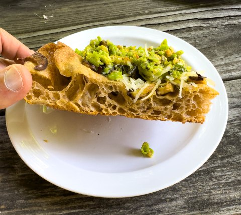| Toppings | We ordered two different squares a Pepperoni square and a “Seasonal” square. The Pepperoni was pepperoni, sauce and cheese. The pepperoni had a great cup and char and was quite spicy. There was a heap of freshly grated parmagian on top. The Seasonal had an eclectic mix of mushroom, shallot, pistachio and pea made into a tapenade that was spread in a huge dollop on top of Cacio Cavallo cheese in the middle of the square Fresh – almost certainly, yes |