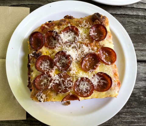 | Shape | A whole pizza is rectangular, but we each ordered a square, like a classic Sicilian shop would deliver. That was a fun and nostalgic memory of NYC! |
