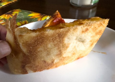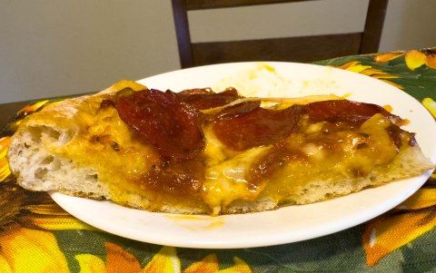 | Cheese | Cheese Type – Moozedell, no detection of other cheese flavor Cheese Distribution – All over Greasy, Stringy – OVERCOOKED (look at the right edge of the pizza picture above). My guess is that the pizzaiola was attempting to get a nice cup and char with the pepperoni and forgot about the non-pepperoni side |
