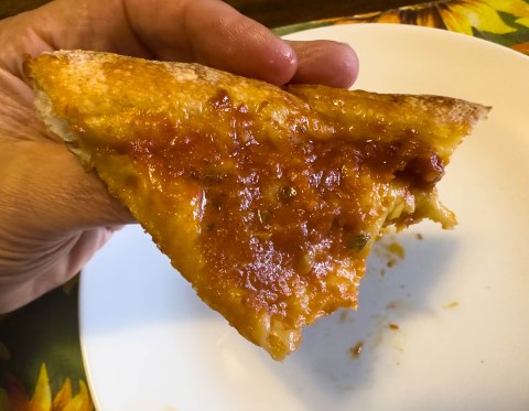 | Sauce | Tangy and on the tick side with a rich tomato taste. Very good, Ample amount too. This is where I believe the franchise model is a problem for Salvatore’s. This store’s pizzaiola used ample sauce as I like versus just a small scoop spread over a large pizza. A different pizzaiola at the same store or a different store might not put an “ample amount” on the pizza. In a franchise model like Salvatore’s, the quality details like consistent pizzaiola to pizzaiola and store to store sauce amount (and taste) are lacking. |