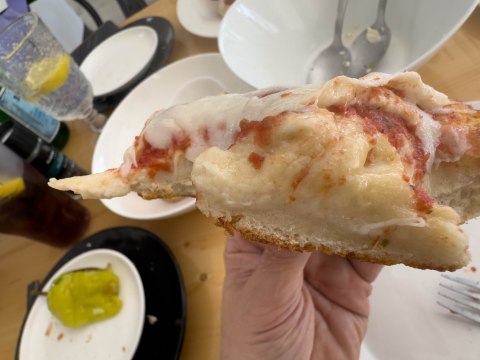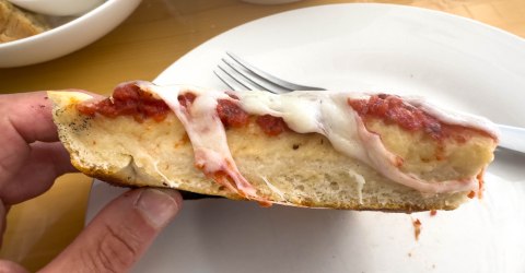 | Overall Rating | Unfortunately, 500 Degrees’ Sicilian was not up to the snuff of their Round Pie of my first visit. At best, their Sicilian is Good (which is not Great) and Meh (which is not good). This is based upon the wet dough layer under the sauce, it’s heaviness, and the slightly burnt bottom. And, just as with dialing in the interior, it takes a while to dial in recipes in a new oven – so I’ll give the benefit of the doubt and say Good. |