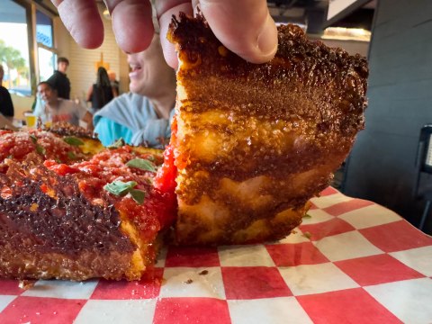| Cornicione | Crispy crunchy Detroit pizzas really don’t have a cornicione since cheese is packed in next to the dough and pan boarder. But that was done to perfection with a browned cheese taste from that cheese edging. |